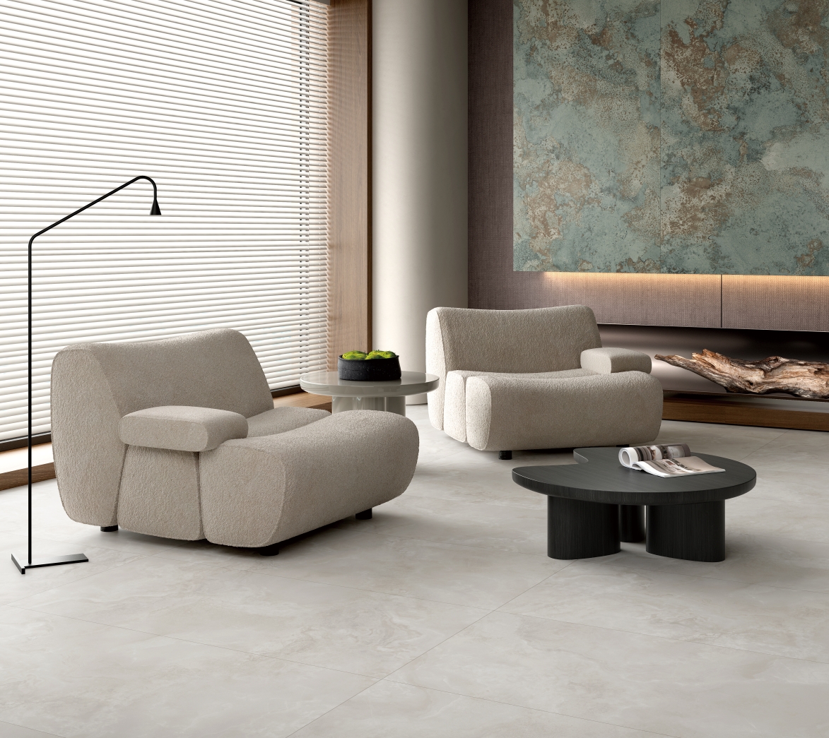 自然通透細膩,灰色線條、肆意飄散的紋理,深淺變化不一縱情延伸, 在空間里獨自綻放光彩,營造了獨特隨性的空間氛圍。